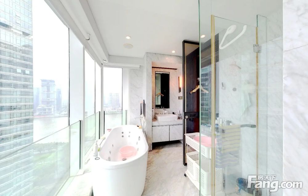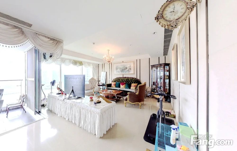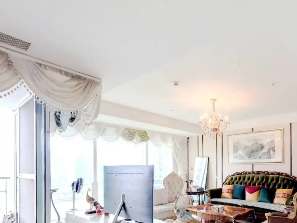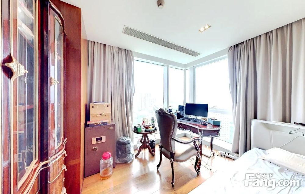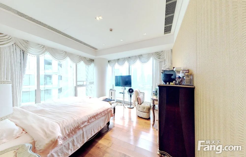 户型介绍开发商装4房2厅4卫,客厅是全景落地窗,与主人房均是南向望园林水景,另一个房间东北向,望着是南国花园方向,全屋都是落地窗采光好好,视野好,双开门电梯一户,私密性好,客厅大阳台