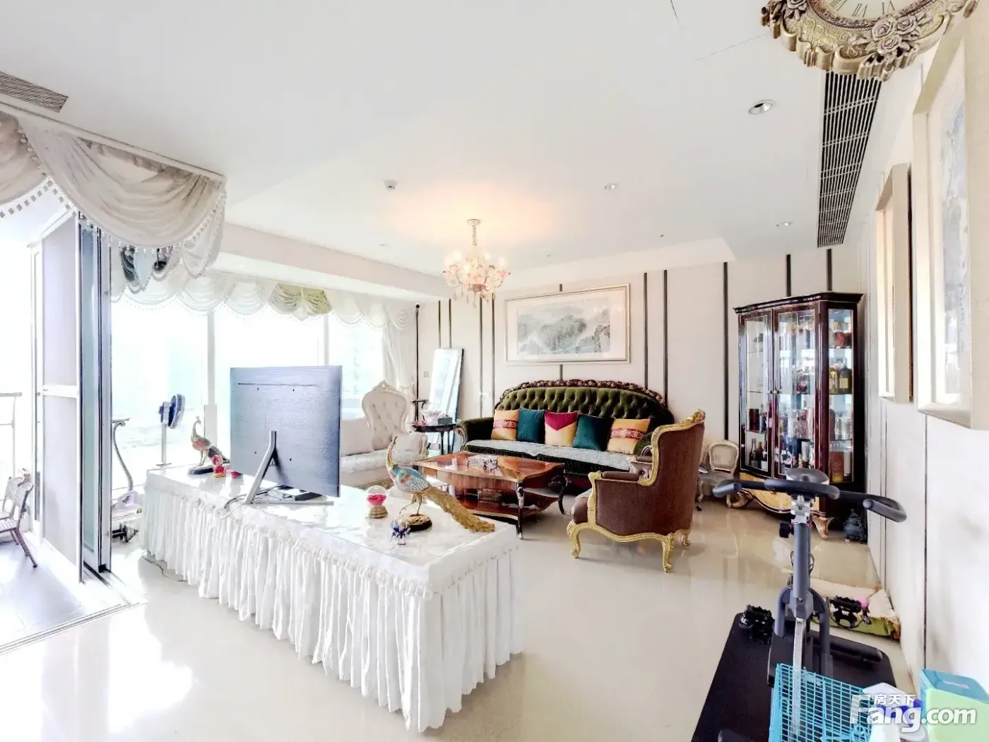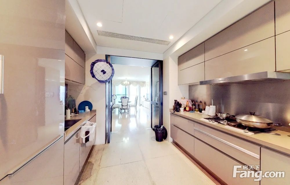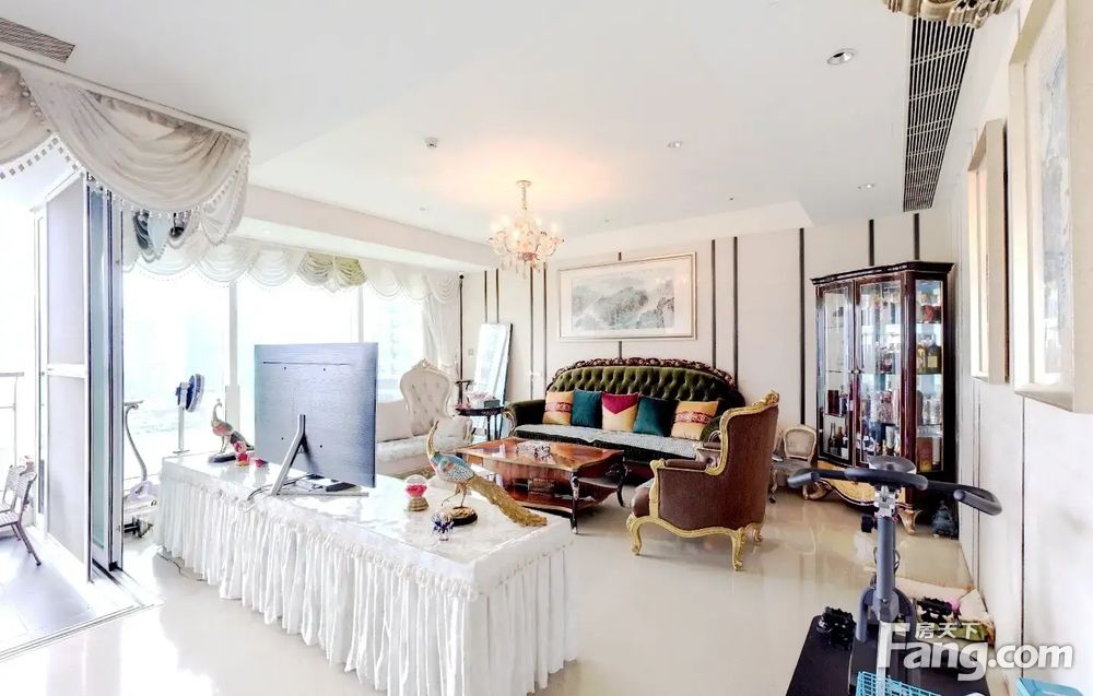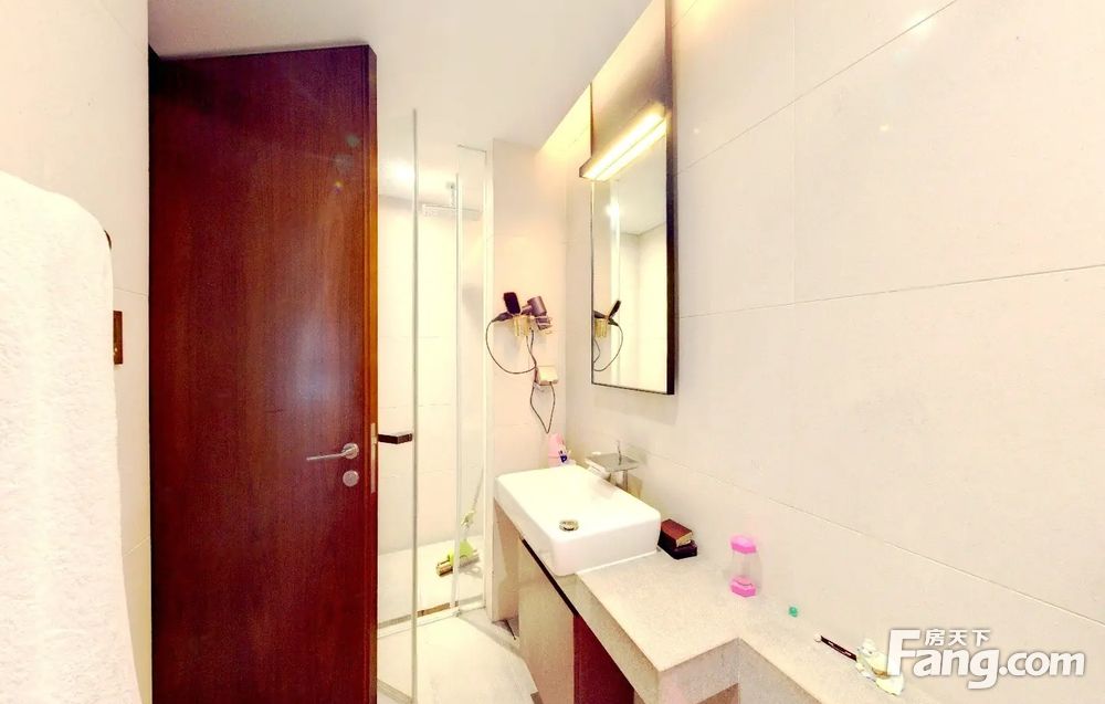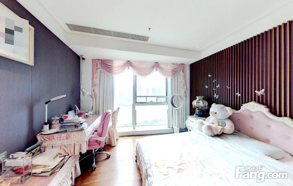 户型介绍开发商装4房2厅4卫,客厅是全景落地窗,与主人房均是南向望园林水景,另一个房间东北向,望着是南国花园方向,全屋都是落地窗采光好好,视野好,双开门电梯一户,私密性好,客厅大阳台